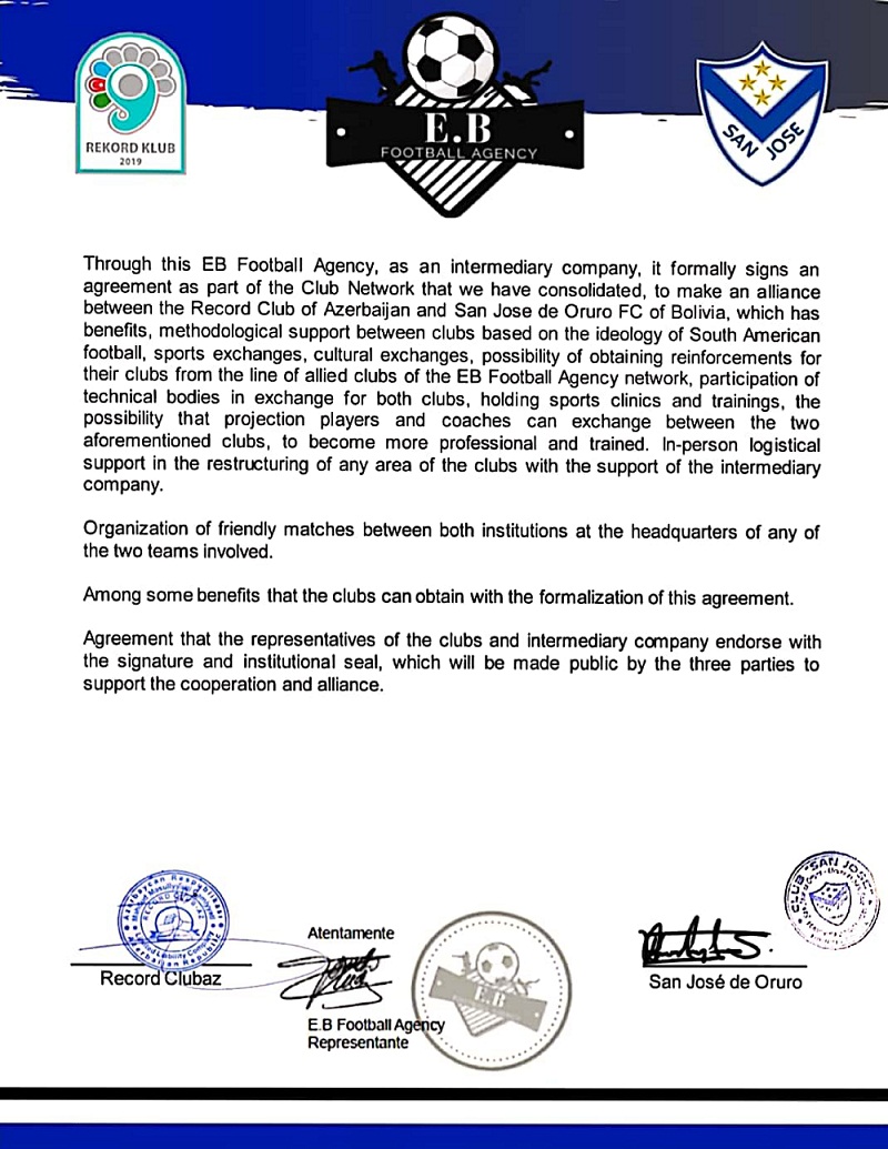 باشگاه رکورد آذربایجان در ادامه توسعه همکاری های خود اینبار با باشگاه سن خوزه بولیوی تفاهم نامه همکاری امضا کرد